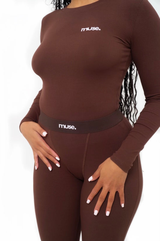 Wrap yourself in the warm elegance of the Muse Lounge Set. This two-piece ensemble is crafted from a premium, ultra-stretch fabric that offers the perfect balance of comfort and style. The rich mocha tone and the deep ivy green flatters every skin tone, making it a wardrobe essential for both lounging and casual outings.